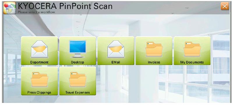 Система PinPoint Scan для сканирования документов состоит из двух компонентов: приложения HyPAS и утилиты, устанавливаемой на клиентский ПК, работающий под управлением Windows или MacOS. Чтобы начать работу, сотруднику необходимо ввести свой персональный PIN-код на панели управления МФУ. После этого появляется возможность отсканировать документ и выбрать один из вариантов дальнейшего использования полученного файла: сохранение в выбранной папке или в облачном хранилище, отправка по электронной почте и т.д.
